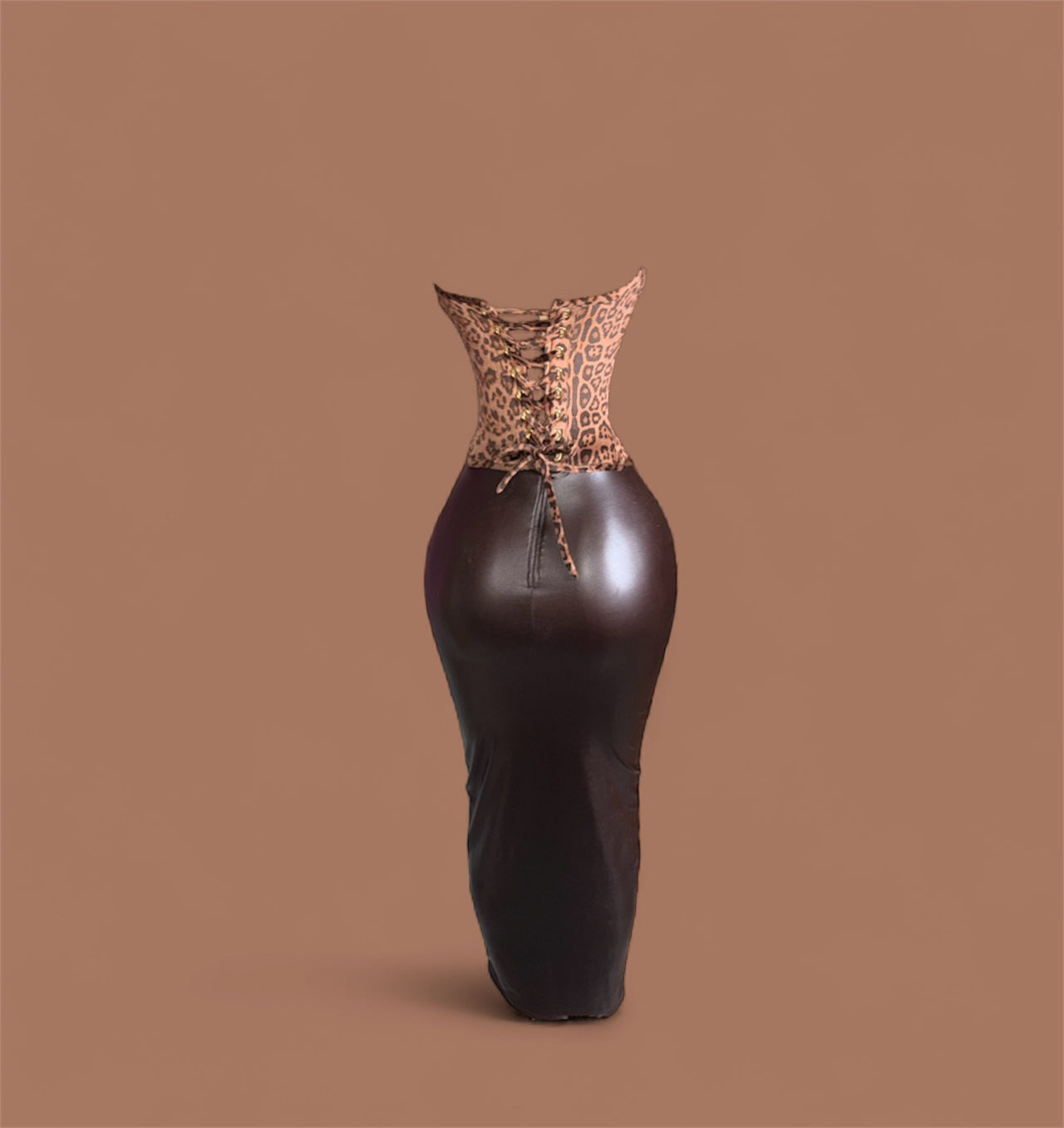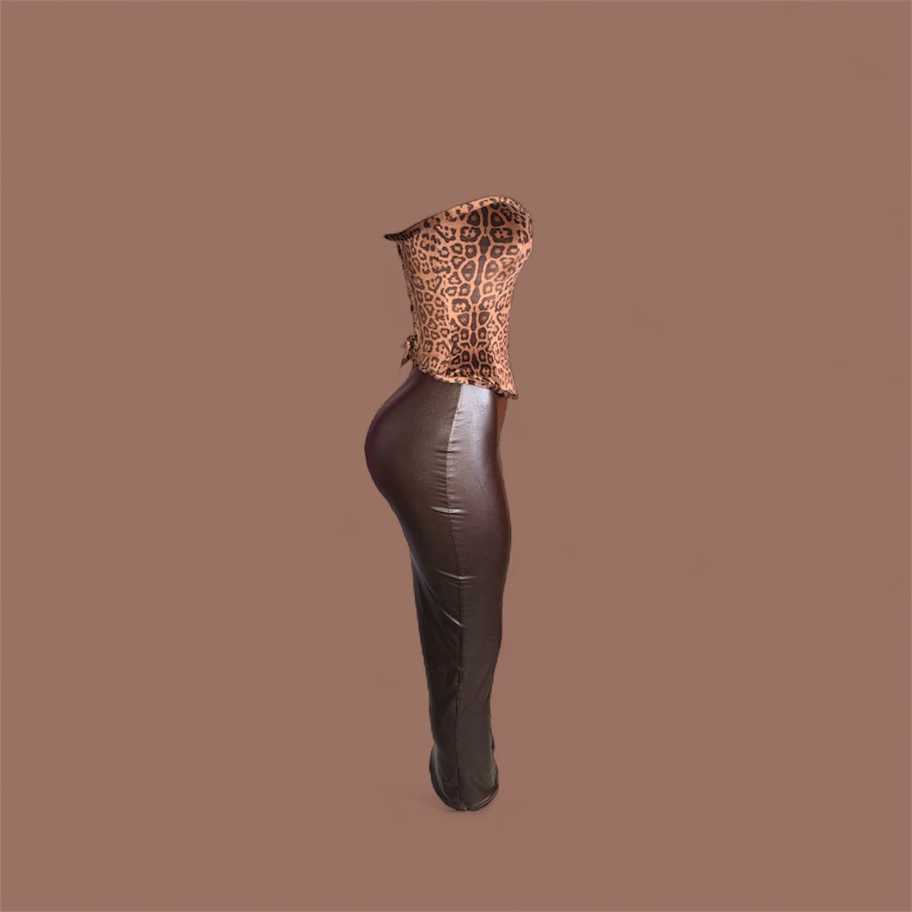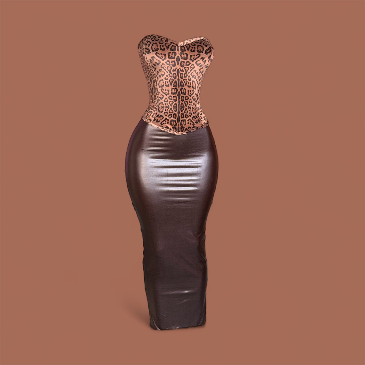 The design features a strapless leopard-print velvet corset with a sculpted sweetheart neckline that accentuates the curves and snatches the waist to perfection. The fabric’s rich animal print adds a wild, confident energy — the kind of detail that instantly commands attention. Vinyl skirt .