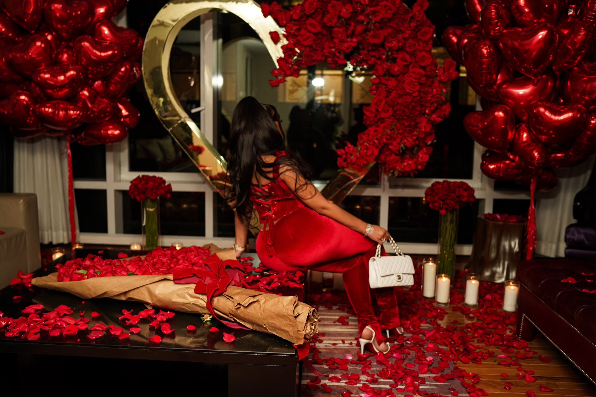 Red velvet two piece corset tying in back and has ties on shoulder and velvet leggings