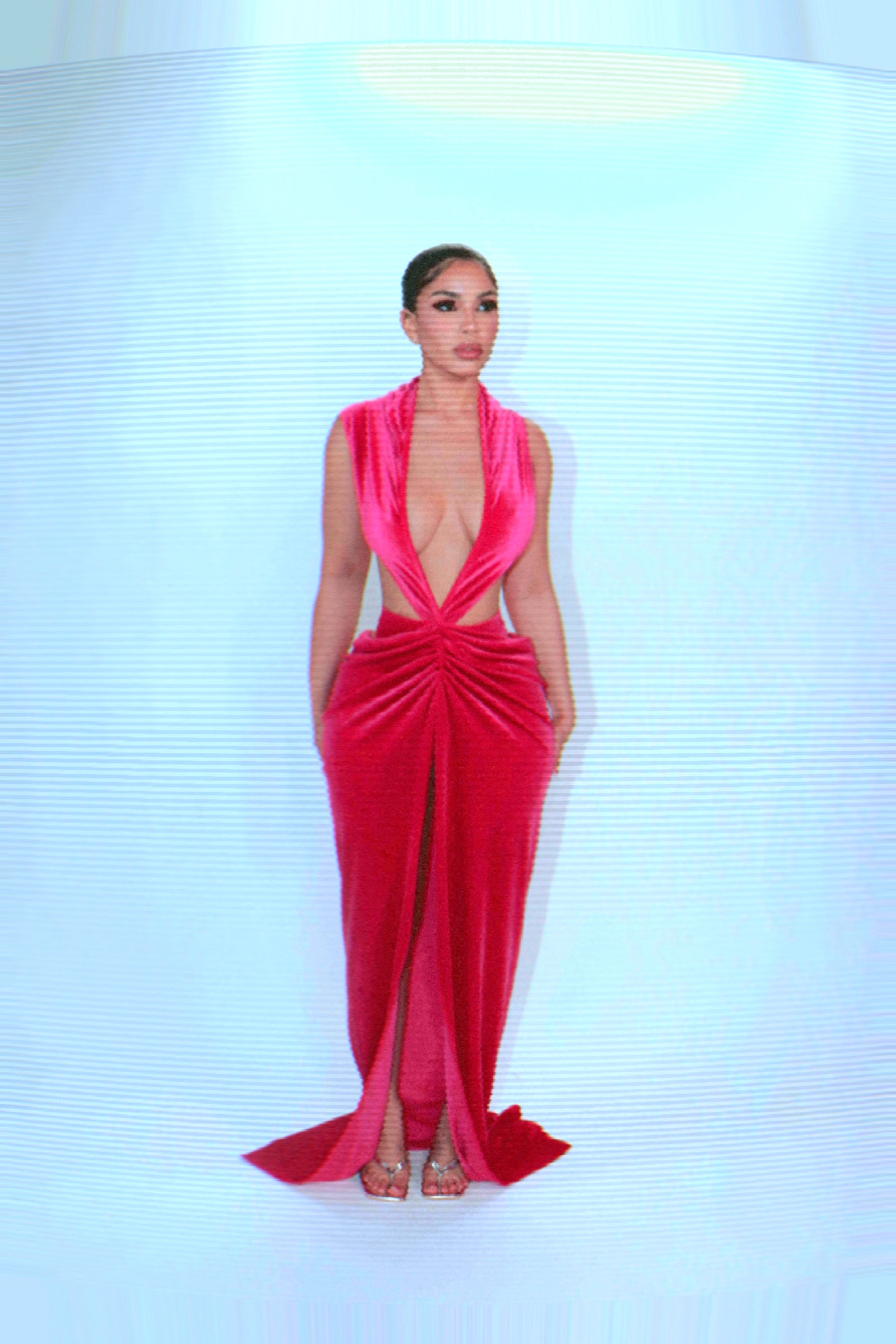 luxurious velvet halter gown featuring a deep plunge neckline, ruched waist, and dramatic front slit with flowing train for bold, timeless elegance.