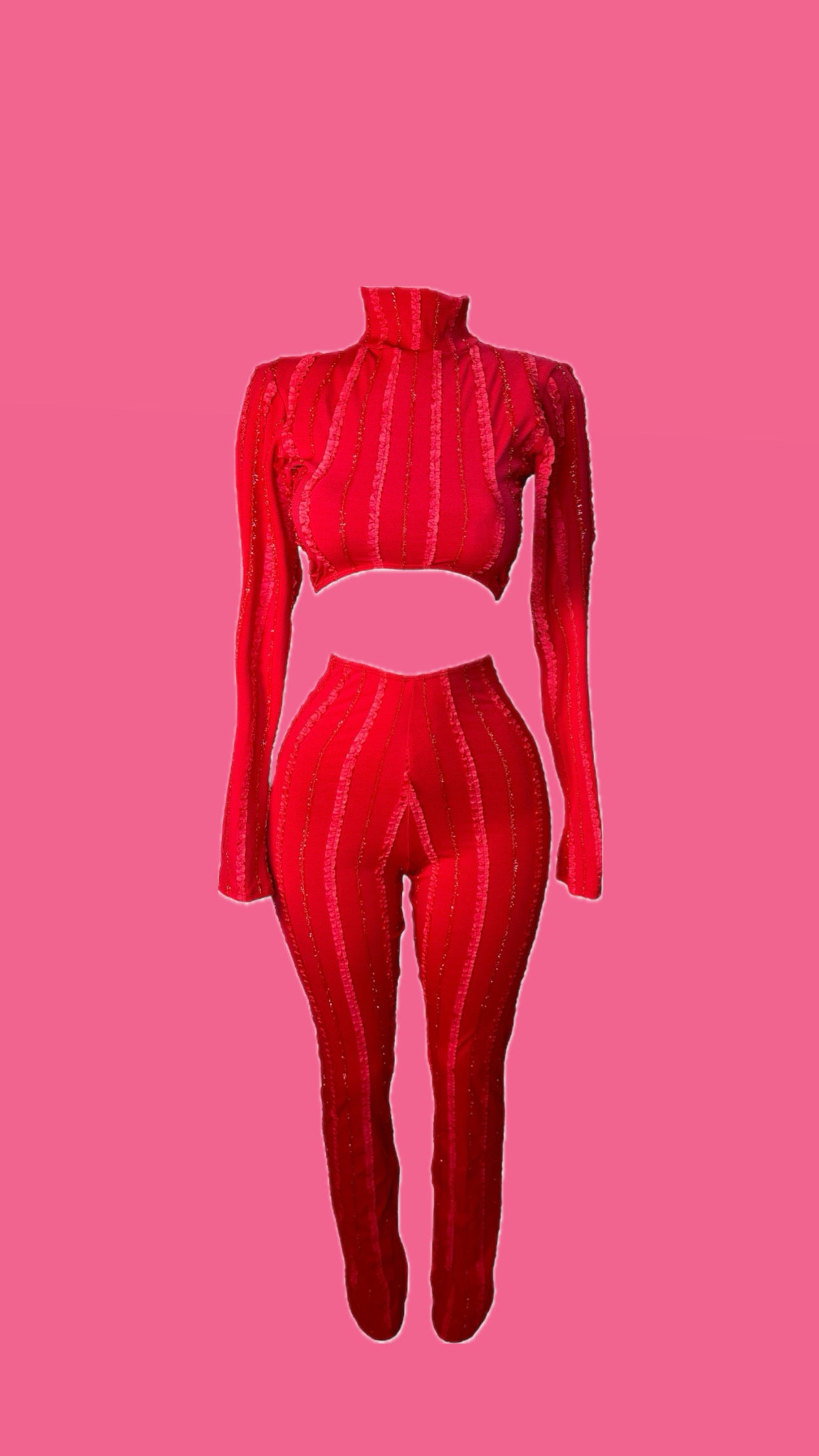 Red two piece with turtle neck and long sleeve top and leggings with zipper in back.