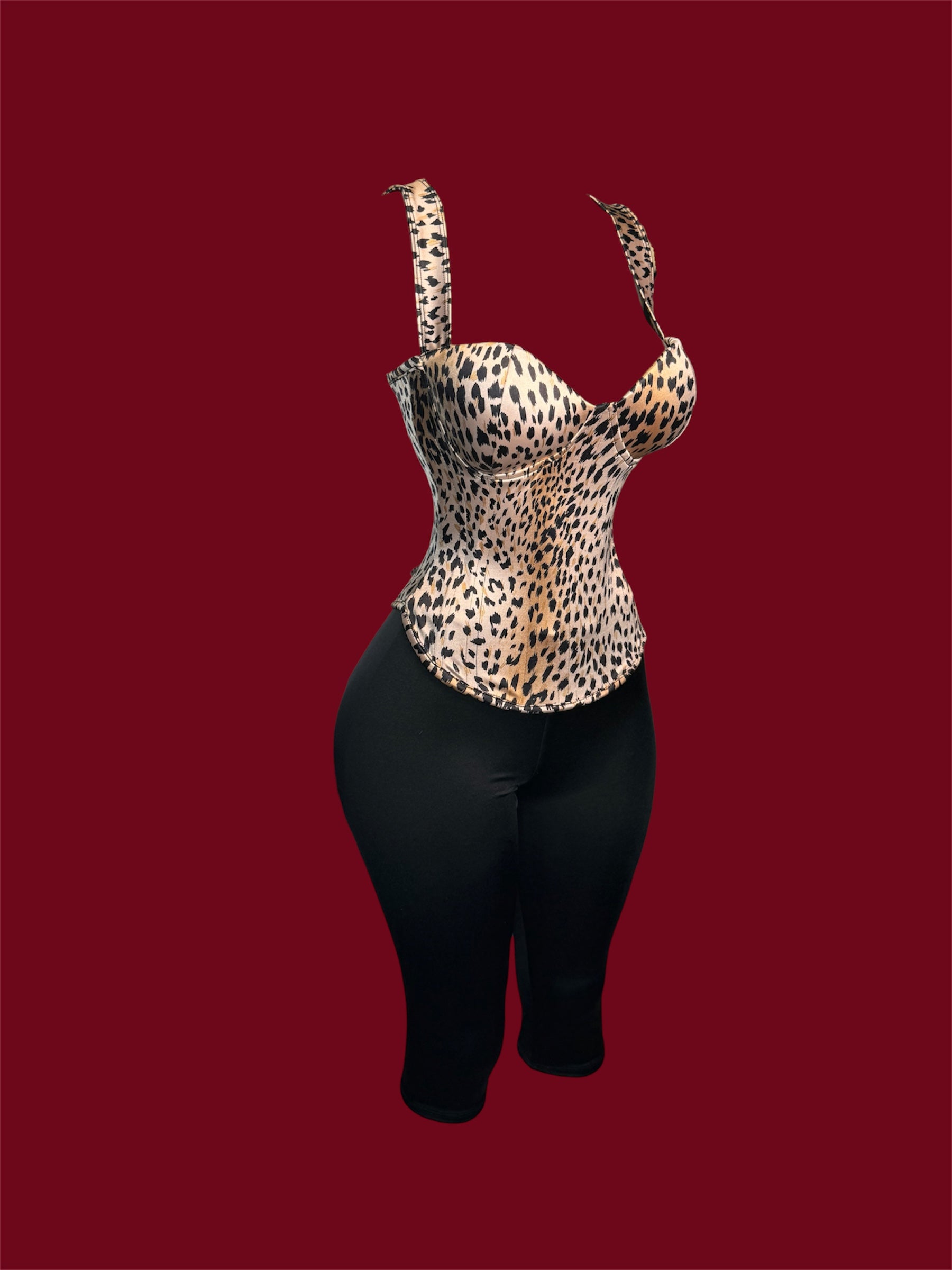 leopard corset designed to lift the bust and cinch the waist effortlessly. Molded cups, bold print, and a fitted shape that enhances every curve — the perfect statement top for a fierce, confident look.